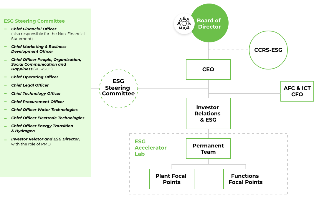 Steering committee reporting to the Chief Executive Officer, composed of the Top Management of De Nora representing the various Group departments. In particular, this committee has the task of monitoring the KPIs related to the main sustainability performances of De Nora and defining actions, initiatives, objectives aimed at improving them.